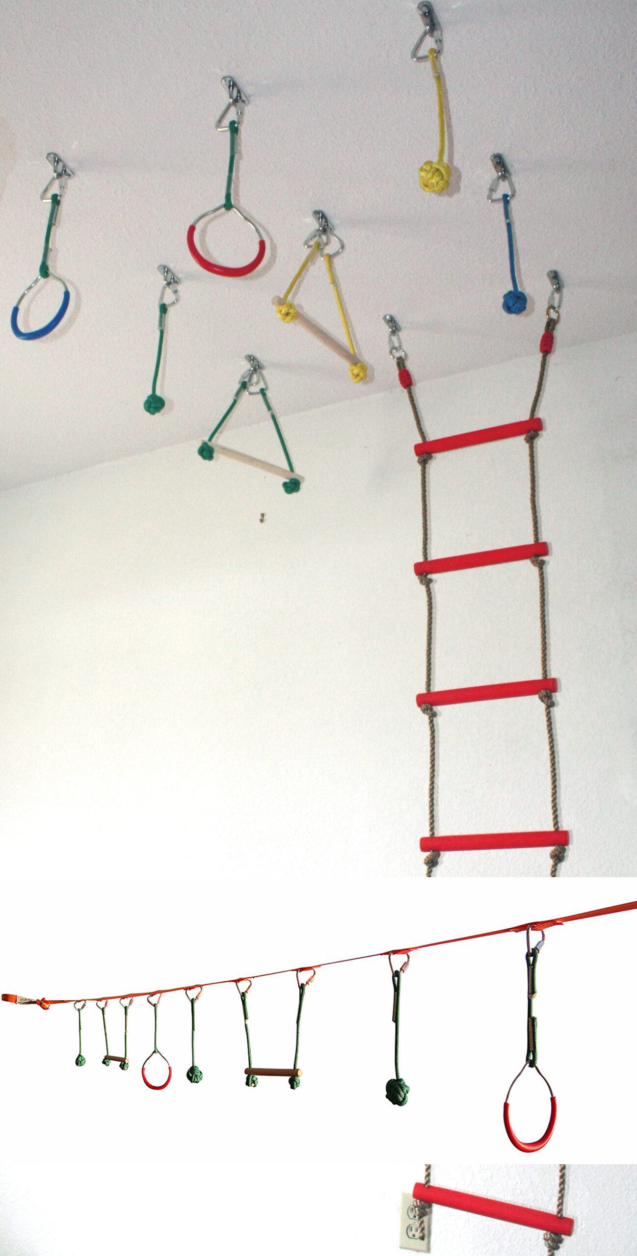 For ceiling mount, the obstacles hung around 14” from ceiling. We recommend buying ½” rope from Home Depot to lengthen each obstacle so your children will be able to grab on the obstacles while standing on the floor. Then shorten the rope when they grow stronger.